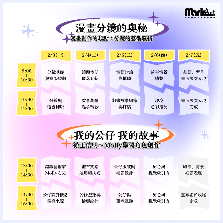 創意之旅:特殊課程 冬、夏令營 限定課程 官方LINE詢問課程 歷年特殊課程 動漫藝術營課程 遊戲動漫角色設計 動漫課程會在一開始練習繪畫動漫人物五官,老師會分享不同的五官、造型和髮型讓孩子學習,並且引導孩子設計自己角色的服裝、武器、戰技元素和配飾等等,讓孩子把心中理想的遊戲英雄人物畫出來。 唯美人物插畫設計 當水彩遇上了人物插畫,會激盪出什麼火花呢?這次的唯美風水彩課程中,讓大家盡情的畫自己喜愛的人物題材;基礎的五官比例、基本肢體、造型設計等等,並針對每個學生的構圖分別指導,使畫面中的人物能展現其最大魅力。水彩上色部分,則會讓孩子在繪畫的過程中練習水彩的濃淡變化、水分控制、渲染等,並教導不同的上色風格,使同學掌握多種畫法,日後能持續運用在自己的創作。 Q版人物似顏繪 Q版似顏繪,對於學習速寫的孩子們來說是一種新的體驗與以往的畫畫課不一樣,速寫是需要大量練習抓出每個人的特色,訓練觀察。孩子們的不同風格、繪畫的感覺以及當下的心情,都會影響孩子們在畫畫的風格與呈現,而這一次的速寫呈現方式將會為孩子帶來不一樣的風格與體驗。 課程內容會包括人臉五官設計、穿衣風格、造型等去運用在作品上,小朋友要觀察出這個人的喜怒哀樂,並把這些呈現在畫面中,畫出一個新的角色Q版風格的人物。 手繪日系基礎漫畫 這幾個年孩子們喜愛”鬼滅之刃”的心聲馬克已經聽到了,所以馬克特別開了漫畫班,從教導小朋友正確的五官比例,練習眼、鼻、嘴、頭髮等各式造型與表情呈現,並學習不同角度的人臉畫法,從而打造出專屬自己的動漫角色!導孩子如何畫出宛如漫畫般的線稿與氛圍,運用畫漫畫的技巧,黑筆與鉛筆輔助,讓自己的人物更加亮眼!除了黑白的呈現,我們也會用色彩來豐富畫面,讓孩子為自己設計的角色挑選頭髮、眼睛、衣服的顏色,在趣味中學習上色技巧。漫畫課程的學習,不只能運用在動漫人物上,正確的人臉比例、角度變化、髮型設計,對於一般的人物繪畫更是受用;而漫畫線條的練習,可加強孩子對於筆觸的掌握度,讓線條不再死板而富有變化。 壓克力藝術營課程 壓克力風格花卉-我的秘密花園 春季裡繁花盛開,小藝術家們當然不能放過這個機會,好好欣賞一下鮮花的美~ 這次的壓克力繪畫課程主題為「花」,美美的花朵都有些不一樣的形體、顏色和構造,甚至每個都有專屬於自己的花語,所以老師會帶領小藝術家們來瞭解不同的花朵,再以不同的繪畫風格創作一幅美麗的花卉畫作。小藝術家們會學習到許多壓克力繪畫技法,也會學習如何找到自己的藝術風格唷~。 壓克力藝術創作-名畫賞析與創作 這一次全新推出的名畫賞析與創作課程,老師會利用數位網站Google Arts & Culture進行教學,將具有特色的藝術家與作品介紹給孩子們,引導孩子創造獨一無二的「藝術筆記」及「壓克力繪畫作品」。Google Arts & Culture具豐富的藝術學習資源,擁有高清的放大縮小功能,可讓觀者放大至非常細緻的部分,甚至可用擴增實境參觀線上美術館。老師將帶領孩子們,透過細緻的鏡頭,發掘作品的細節,並學習作品中的視覺元素及繪畫技巧,孩子會將所學記錄於藝術筆記當中。完成藝術筆記後,孩子會運用筆記中所學的視覺元素、風格進行壓克力繪畫創作,並完成獨一無二的繪畫作品。除了做到學以致用,孩子也會增加對藝術的感知,提升創意思維。 其他多元藝術課程 日子中的風景-速寫日記 最自由揮灑的課程就在馬克藝術盒子─「 日子中的風景-速寫日記 」拋開以往繪畫的精準度,放手揮灑畫下美麗風景的瞬間馬克以多種實用速寫技巧,不同主題示範步驟拆解,讓初學者也能輕鬆下筆!第二天寫生實戰帶領孩子到動物園把自己最想紀錄下來的風景動物,利用速寫的方式把它畫下來哦~ Zentangle纏-圖文與心靈的相聚 「吻」-克林姆這驚世的一吻,成就了藝術史上最令人動容的一刻,並繪出眾人心目中對於愛情的憧憬與美好,特別是在金碧輝煌、拜占庭風格的場景當中,以雙膝跪地,環抱的姿勢,進行親吻,更是增添了浪漫的感受,搭配舒心禪繞~心靈作畫、頭腦瑜伽,讓這一年的慌亂忐忑所有的不開心,一起在這一堂課被藝術治癒,每個孩子專注於每一筆畫,跟著自己的感覺走,與自己心靈對話,自在又愉快就在這樣慢慢隨著筆下放鬆自己,放鬆心情。這一次的課程特別利用禪繞的表現方式去貼近他的世界,也讓我們置身在克林姆《吻》當中,看看我們這一次與偉大的藝術家能擦出什麼樣的火花吧 名畫賞析&創作-手繪藝術筆 這一次全新推出的名畫賞析與創作課程,老師會利用數位網站Google Arts & Culture進行教學,將具有特色的藝術家與作品介紹給孩子們,引導孩子創造獨一無二的「藝術筆記」及「壓克力繪畫作品」。Google Arts & Culture具豐富的藝術學習資源,擁有高清的放大縮小功能,可讓觀者放大至非常細緻的部分,甚至可用擴增實境參觀線上美術館。老師將帶領孩子們,透過細緻的鏡頭,發掘作品的細節,並學習作品中的視覺元素及繪畫技巧,孩子會將所學記錄於藝術筆記當中。 回頂端